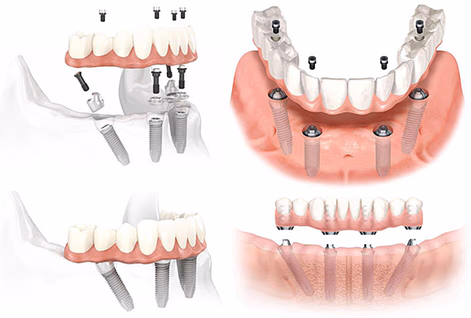 All-on-4: Implică utilizarea a patru implanturi dentare pentru a susține o proteză fixă. Aceasta este o opțiune ideală pentru pacienții care au pierdut toți dinții sau au dinți grav afectați care necesită extracție.
